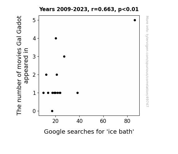This means 44% of the change in the one variable (i.e., Google searches for 'ice bath') is predictable based on the change in the other (i.e., The number of movies Gal Gadot appeared in) over the 15 years from 2009 through 2023.