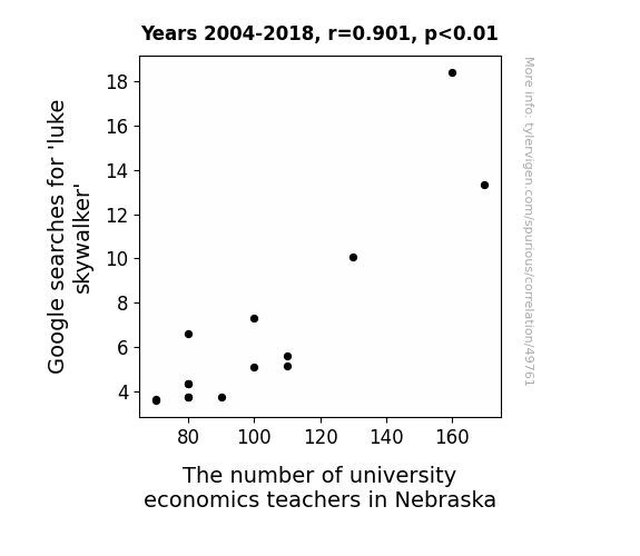 This means 81.2% of the change in the one variable (i.e., The number of university economics teachers in Nebraska) is predictable based on the change in the other (i.e., Google searches for 'luke skywalker') over the 15 years from 2004 through 2018.