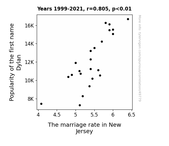 This means 64.7% of the change in the one variable (i.e., The marriage rate in New Jersey) is predictable based on the change in the other (i.e., Popularity of the first name Dylan) over the 23 years from 1999 through 2021.