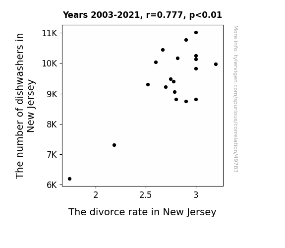 This means 60.4% of the change in the one variable (i.e., The divorce rate in New Jersey) is predictable based on the change in the other (i.e., The number of dishwashers in New Jersey) over the 19 years from 2003 through 2021.