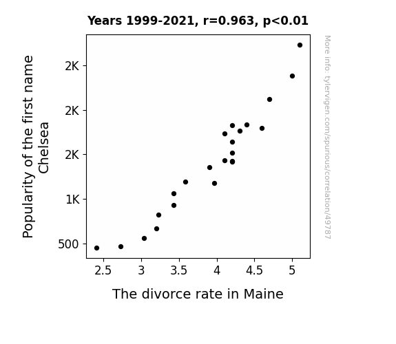 This means 92.8% of the change in the one variable (i.e., The divorce rate in Maine) is predictable based on the change in the other (i.e., Popularity of the first name Chelsea) over the 23 years from 1999 through 2021.