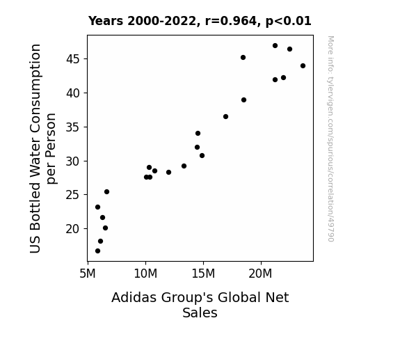 This means 92.9% of the change in the one variable (i.e., Adidas Group's Global Net Sales) is predictable based on the change in the other (i.e., US Bottled Water Consumption per Person) over the 23 years from 2000 through 2022.