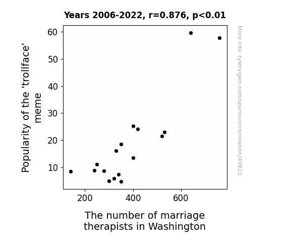 This means 76.7% of the change in the one variable (i.e., The number of marriage therapists in Washington) is predictable based on the change in the other (i.e., Popularity of the 'trollface' meme) over the 17 years from 2006 through 2022.