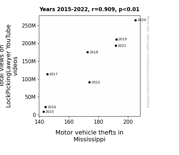 This means 82.6% of the change in the one variable (i.e., Motor vehicle thefts in Mississippi) is predictable based on the change in the other (i.e., Total views on LockPickingLawyer YouTube videos) over the 8 years from 2015 through 2022.