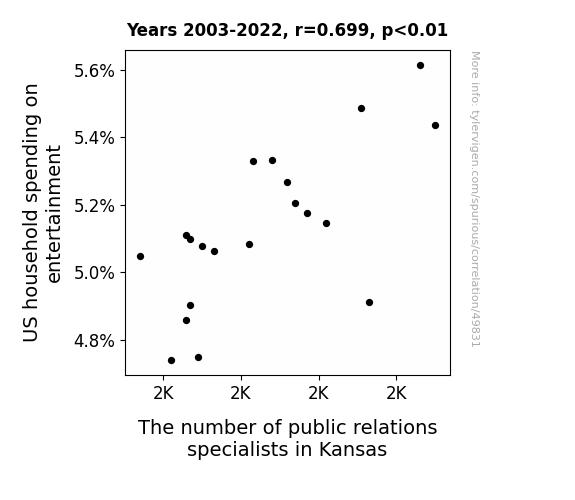 This means 48.9% of the change in the one variable (i.e., The number of public relations specialists in Kansas) is predictable based on the change in the other (i.e., US household spending on entertainment) over the 20 years from 2003 through 2022.