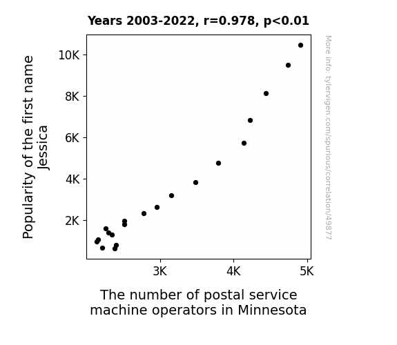This means 95.7% of the change in the one variable (i.e., The number of postal service machine operators in Minnesota) is predictable based on the change in the other (i.e., Popularity of the first name Jessica) over the 20 years from 2003 through 2022.