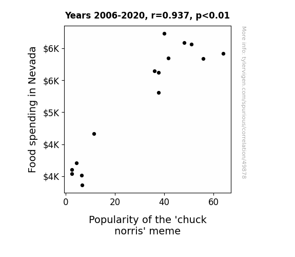 This means 87.9% of the change in the one variable (i.e., Popularity of the 'chuck norris' meme) is predictable based on the change in the other (i.e., Food spending in Nevada) over the 15 years from 2006 through 2020.