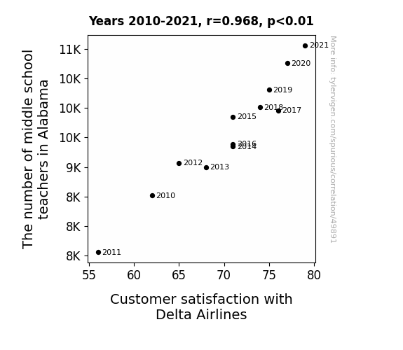 This means 93.7% of the change in the one variable (i.e., Customer satisfaction with Delta Airlines) is predictable based on the change in the other (i.e., The number of middle school teachers in Alabama) over the 12 years from 2010 through 2021.