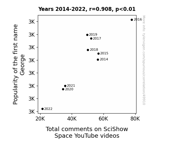 This means 82.5% of the change in the one variable (i.e., Total comments on SciShow Space YouTube videos) is predictable based on the change in the other (i.e., Popularity of the first name George) over the 9 years from 2014 through 2022.