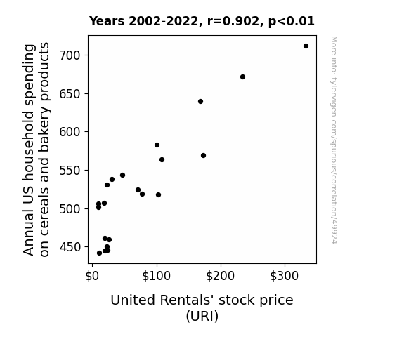This means 81.4% of the change in the one variable (i.e., United Rentals' stock price (URI)) is predictable based on the change in the other (i.e., Annual US household spending on cereals and bakery products) over the 21 years from 2002 through 2022.