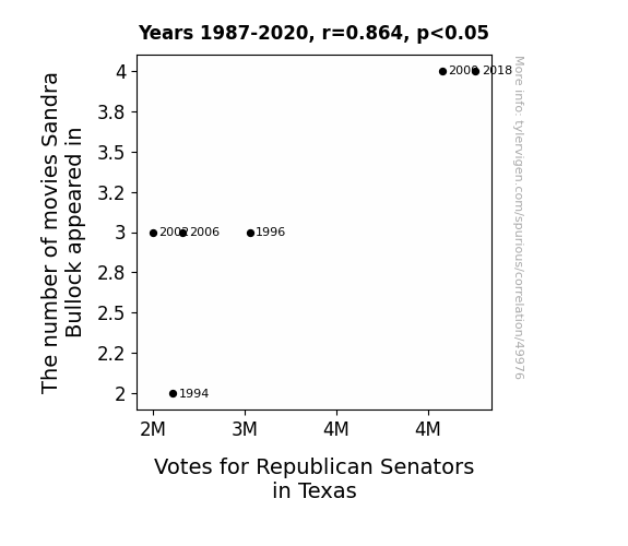 This means 74.7% of the change in the one variable (i.e., Votes for Republican Senators in Texas) is predictable based on the change in the other (i.e., The number of movies Sandra Bullock appeared in) over the 6 years from 1987 through 2020.