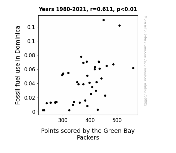 This means 37.3% of the change in the one variable (i.e., Points scored by the Green Bay Packers) is predictable based on the change in the other (i.e., Fossil fuel use in Dominica) over the 42 years from 1980 through 2021.