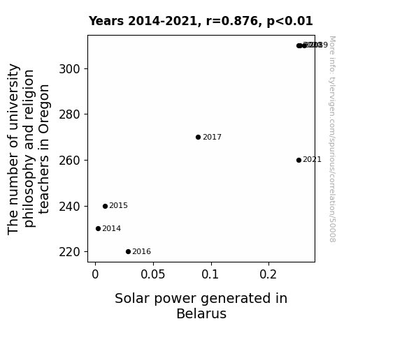 This means 76.7% of the change in the one variable (i.e., Solar power generated in Belarus) is predictable based on the change in the other (i.e., The number of university philosophy and religion teachers in Oregon) over the 8 years from 2014 through 2021.