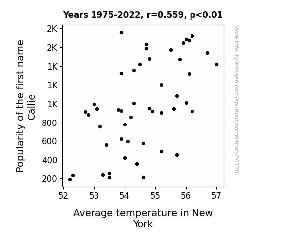 This means 31.3% of the change in the one variable (i.e., Average temperature in New York) is predictable based on the change in the other (i.e., Popularity of the first name Callie) over the 48 years from 1975 through 2022.