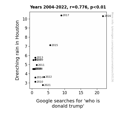 This means 60.2% of the change in the one variable (i.e., Google searches for 'who is donald trump') is predictable based on the change in the other (i.e., Drenching rain in Houston) over the 14 years from 2004 through 2022.