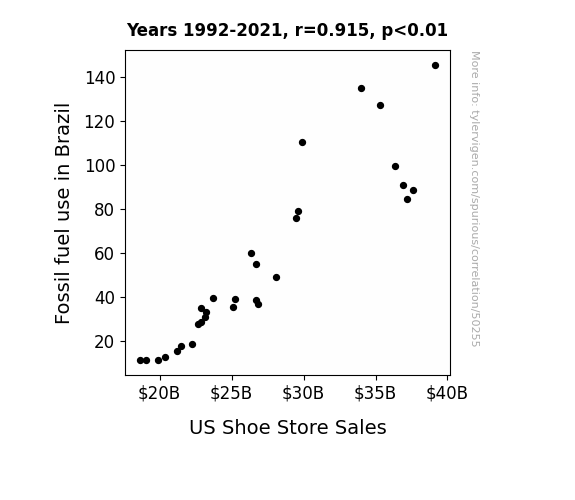 This means 83.7% of the change in the one variable (i.e., US Shoe Store Sales) is predictable based on the change in the other (i.e., Fossil fuel use in Brazil) over the 30 years from 1992 through 2021.