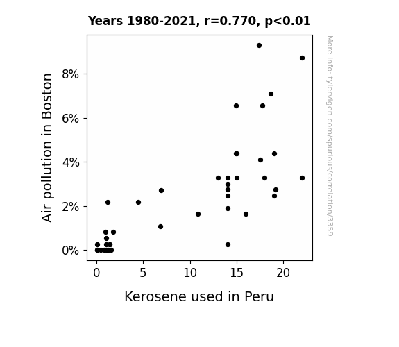 This is exacerbated by the fact that I used "Years" as the base variable. Lots of things happen in a year that are not related to each other! Most studies would use something like "one person" in stead of "one year" to be the "thing" studied. - Observations not independent: For many variables, sequential years are not independent of each other. You will often see trend-lines form. If a population of people is continuously doing something every day, there is no reason to think they would suddenly change how they are doing that thing on January 1. A naive p-value calculation does not take this into account.