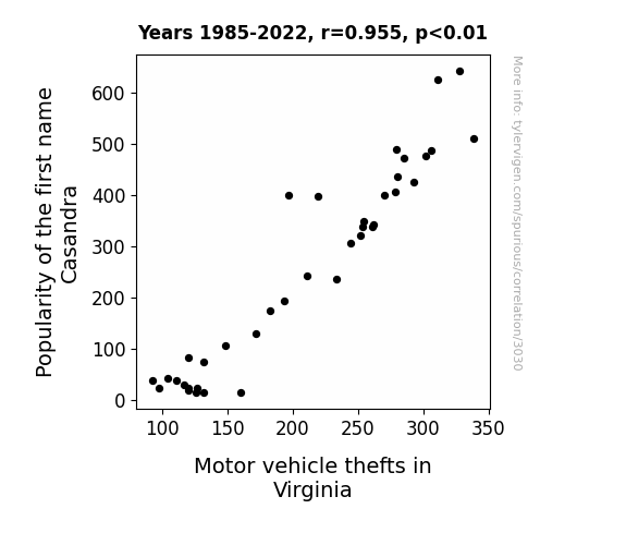 This is exacerbated by the fact that I used "Years" as the base variable. Lots of things happen in a year that are not related to each other! Most studies would use something like "one person" in stead of "one year" to be the "thing" studied. - Observations not independent: For many variables, sequential years are not independent of each other. You will often see trend-lines form. If a population of people is continuously doing something every day, there is no reason to think they would suddenly change how they are doing that thing on January 1. A naive p-value calculation does not take this into account.