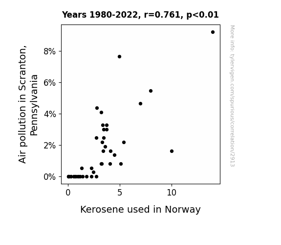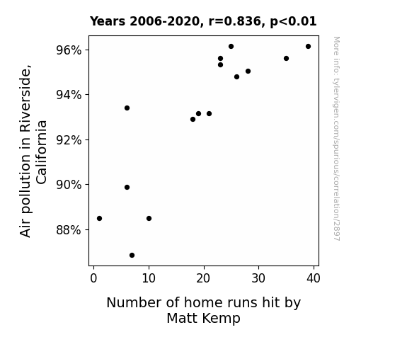 This is exacerbated by the fact that I used "Years" as the base variable. Lots of things happen in a year that are not related to each other! Most studies would use something like "one person" in stead of "one year" to be the "thing" studied. - Observations not independent: For many variables, sequential years are not independent of each other. You will often see trend-lines form. If a population of people is continuously doing something every day, there is no reason to think they would suddenly change how they are doing that thing on January 1. A naive p-value calculation does not take this into account.
