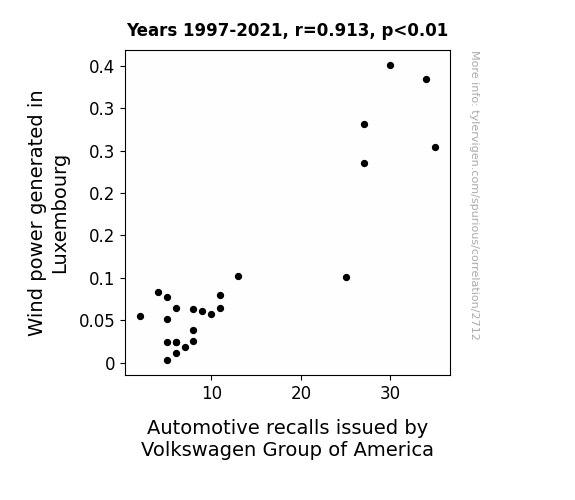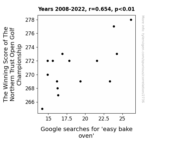 This is exacerbated by the fact that I used "Years" as the base variable. Lots of things happen in a year that are not related to each other! Most studies would use something like "one person" in stead of "one year" to be the "thing" studied. - Observations not independent: For many variables, sequential years are not independent of each other. You will often see trend-lines form. If a population of people is continuously doing something every day, there is no reason to think they would suddenly change how they are doing that thing on January 1. A naive p-value calculation does not take this into account.