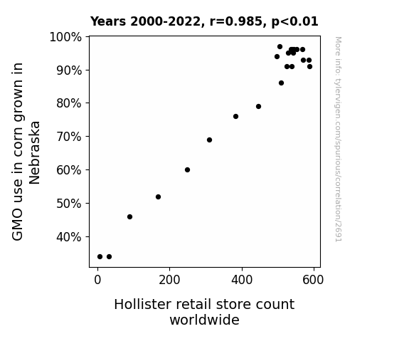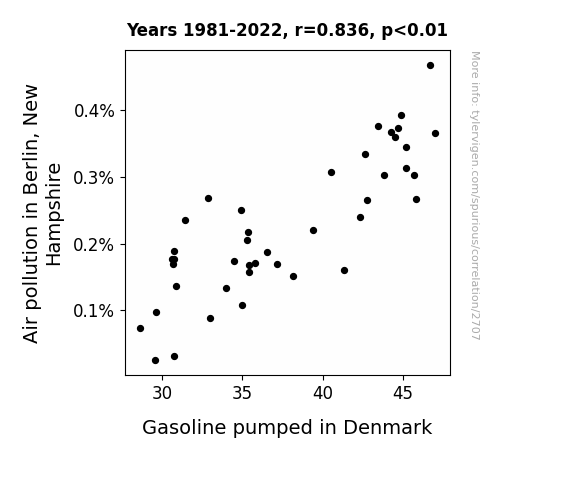 This is exacerbated by the fact that I used "Years" as the base variable. Lots of things happen in a year that are not related to each other! Most studies would use something like "one person" in stead of "one year" to be the "thing" studied. - Observations not independent: For many variables, sequential years are not independent of each other. You will often see trend-lines form. If a population of people is continuously doing something every day, there is no reason to think they would suddenly change how they are doing that thing on January 1. A naive p-value calculation does not take this into account.