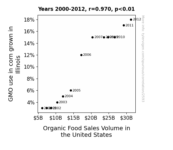 This is exacerbated by the fact that I used "Years" as the base variable. Lots of things happen in a year that are not related to each other! Most studies would use something like "one person" in stead of "one year" to be the "thing" studied. - Observations not independent: For many variables, sequential years are not independent of each other. You will often see trend-lines form. If a population of people is continuously doing something every day, there is no reason to think they would suddenly change how they are doing that thing on January 1. A naive p-value calculation does not take this into account.