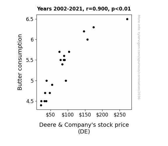 - Data dredging: I have 25,156 variables in my database. I compare all these variables against each other to find ones that randomly match up. That's 632,824,336 correlation calculations! This is called “data dredging.”