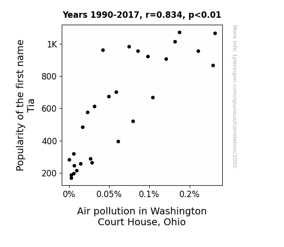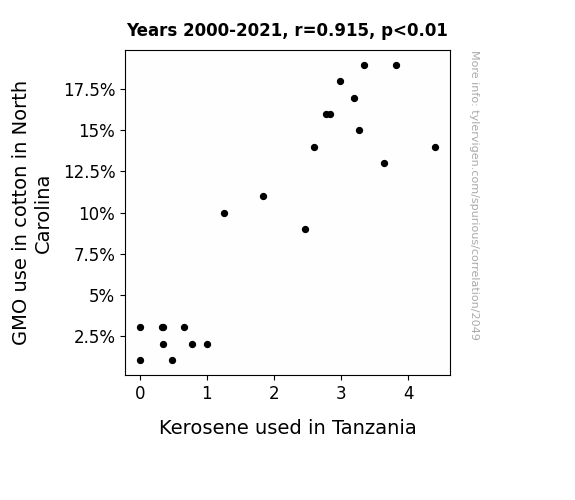 This is exacerbated by the fact that I used "Years" as the base variable. Lots of things happen in a year that are not related to each other! Most studies would use something like "one person" in stead of "one year" to be the "thing" studied. - Observations not independent: For many variables, sequential years are not independent of each other. You will often see trend-lines form. If a population of people is continuously doing something every day, there is no reason to think they would suddenly change how they are doing that thing on January 1. A naive p-value calculation does not take this into account.