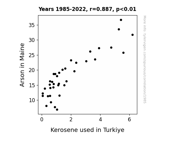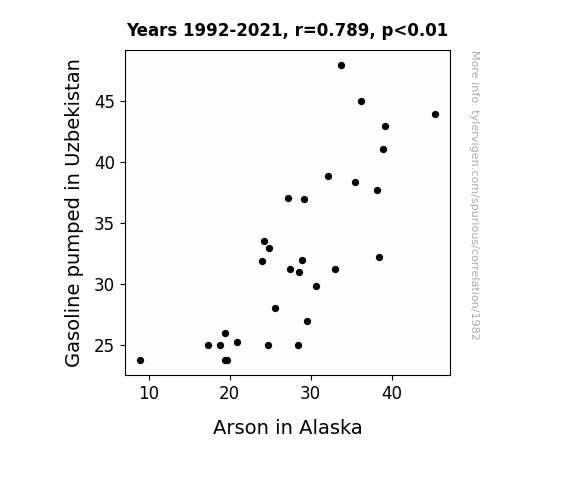This is exacerbated by the fact that I used "Years" as the base variable. Lots of things happen in a year that are not related to each other! Most studies would use something like "one person" in stead of "one year" to be the "thing" studied. - Observations not independent: For many variables, sequential years are not independent of each other. You will often see trend-lines form. If a population of people is continuously doing something every day, there is no reason to think they would suddenly change how they are doing that thing on January 1. A naive p-value calculation does not take this into account.