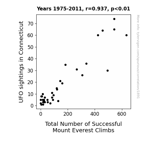This is exacerbated by the fact that I used "Years" as the base variable. Lots of things happen in a year that are not related to each other! Most studies would use something like "one person" in stead of "one year" to be the "thing" studied. - Observations not independent: For many variables, sequential years are not independent of each other. You will often see trend-lines form. If a population of people is continuously doing something every day, there is no reason to think they would suddenly change how they are doing that thing on January 1. A naive p-value calculation does not take this into account.