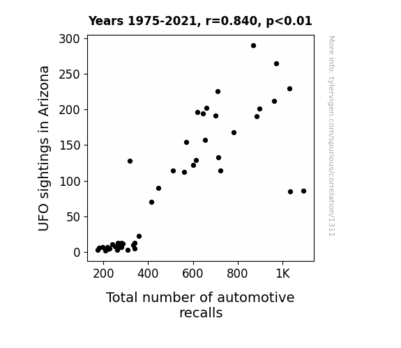 This is exacerbated by the fact that I used "Years" as the base variable. Lots of things happen in a year that are not related to each other! Most studies would use something like "one person" in stead of "one year" to be the "thing" studied. - Observations not independent: For many variables, sequential years are not independent of each other. You will often see trend-lines form. If a population of people is continuously doing something every day, there is no reason to think they would suddenly change how they are doing that thing on January 1. A naive p-value calculation does not take this into account.