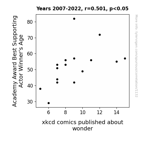 This is exacerbated by the fact that I used "Years" as the base variable. Lots of things happen in a year that are not related to each other! Most studies would use something like "one person" in stead of "one year" to be the "thing" studied. - Observations not independent: For many variables, sequential years are not independent of each other. You will often see trend-lines form. If a population of people is continuously doing something every day, there is no reason to think they would suddenly change how they are doing that thing on January 1. A naive p-value calculation does not take this into account.