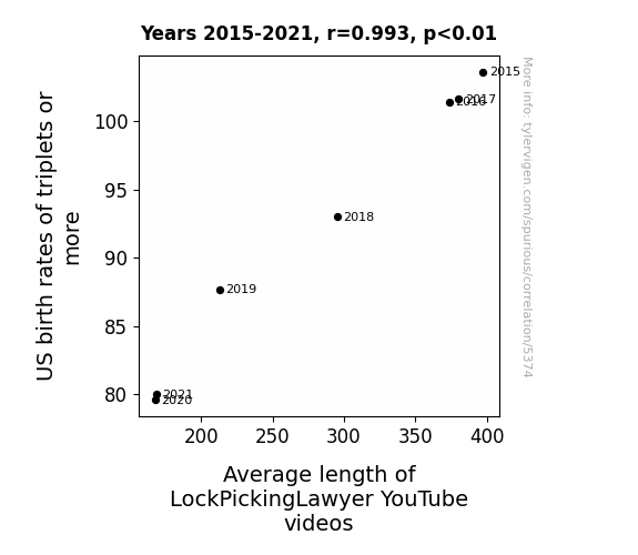 This is exacerbated by the fact that I used "Years" as the base variable. Lots of things happen in a year that are not related to each other! Most studies would use something like "one person" in stead of "one year" to be the "thing" studied. - Observations not independent: For many variables, sequential years are not independent of each other. You will often see trend-lines form. If a population of people is continuously doing something every day, there is no reason to think they would suddenly change how they are doing that thing on January 1. A naive p-value calculation does not take this into account.