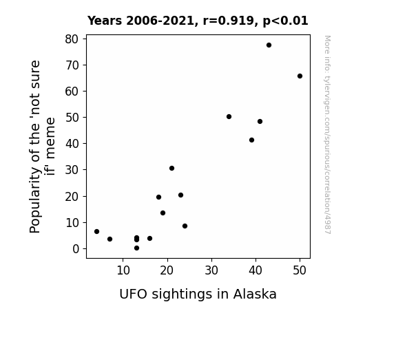 This is exacerbated by the fact that I used "Years" as the base variable. Lots of things happen in a year that are not related to each other! Most studies would use something like "one person" in stead of "one year" to be the "thing" studied. - Observations not independent: For many variables, sequential years are not independent of each other. You will often see trend-lines form. If a population of people is continuously doing something every day, there is no reason to think they would suddenly change how they are doing that thing on January 1. A naive p-value calculation does not take this into account.