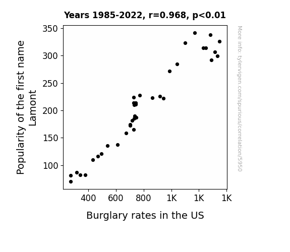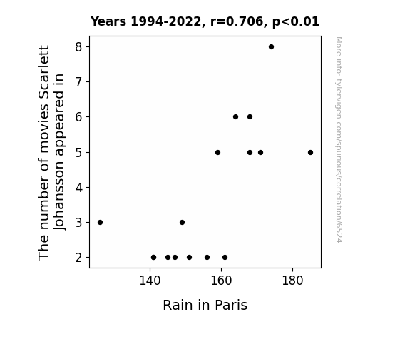 This is exacerbated by the fact that I used "Years" as the base variable. Lots of things happen in a year that are not related to each other! Most studies would use something like "one person" in stead of "one year" to be the "thing" studied. - Observations not independent: For many variables, sequential years are not independent of each other. You will often see trend-lines form. If a population of people is continuously doing something every day, there is no reason to think they would suddenly change how they are doing that thing on January 1. A naive p-value calculation does not take this into account.