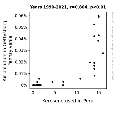 This is exacerbated by the fact that I used "Years" as the base variable. Lots of things happen in a year that are not related to each other! Most studies would use something like "one person" in stead of "one year" to be the "thing" studied. - Observations not independent: For many variables, sequential years are not independent of each other. You will often see trend-lines form. If a population of people is continuously doing something every day, there is no reason to think they would suddenly change how they are doing that thing on January 1. A naive p-value calculation does not take this into account.