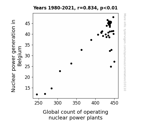 This means 69.6% of the change in the one variable (i.e., Global count of operating nuclear power plants) is predictable based on the change in the other (i.e., Nuclear power generation in Belgium) over the 42 years from 1980 through 2021.