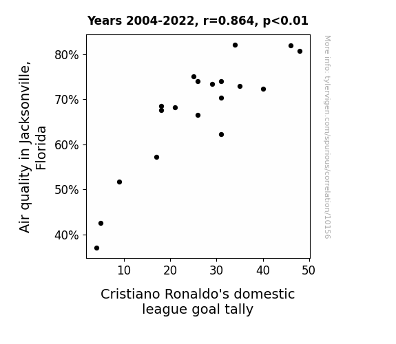 This means 74.6% of the change in the one variable (i.e., Cristiano Ronaldo's domestic league goal tally) is predictable based on the change in the other (i.e., Air quality in Jacksonville, Florida) over the 19 years from 2004 through 2022.