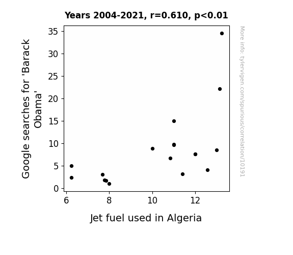 This means 37.2% of the change in the one variable (i.e., Jet fuel used in Algeria) is predictable based on the change in the other (i.e., Google searches for 'Barack Obama') over the 18 years from 2004 through 2021.