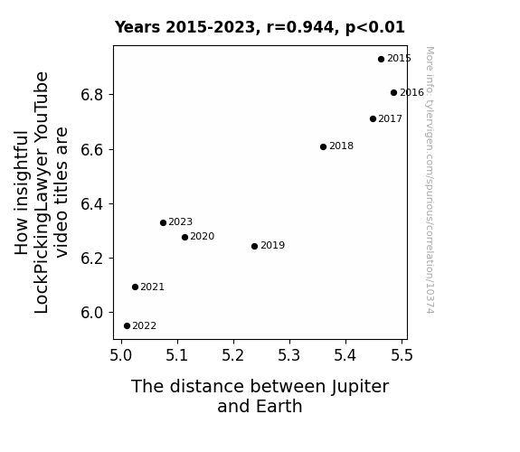 This means 89.2% of the change in the one variable (i.e., The distance between Jupiter and Earth) is predictable based on the change in the other (i.e., How insightful LockPickingLawyer YouTube video titles are) over the 9 years from 2015 through 2023.