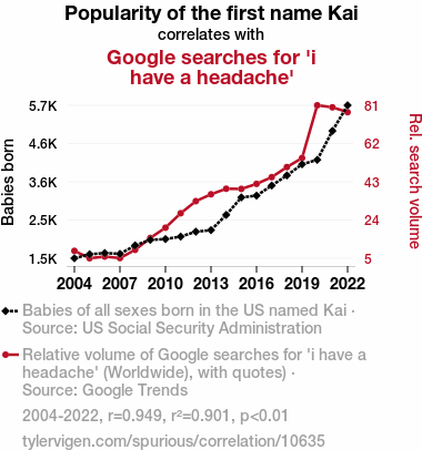 This means 90.1% of the change in the one variable (i.e., Google searches for 'i have a headache') is predictable based on the change in the other (i.e., Popularity of the first name Kai) over the 19 years from 2004 through 2022.