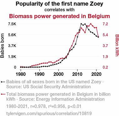 This means 95.6% of the change in the one variable (i.e., Biomass power generated in Belgium) is predictable based on the change in the other (i.e., Popularity of the first name Zoey) over the 42 years from 1980 through 2021.