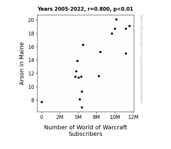This means 63.9% of the change in the one variable (i.e., Number of World of Warcraft Subscribers) is predictable based on the change in the other (i.e., Arson in Maine) over the 18 years from 2005 through 2022.
