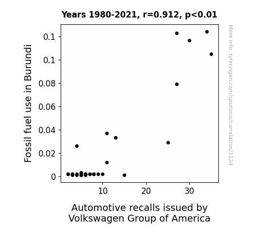 With a correlation coefficient of 0.9120695 and a p-value less than 0.01 for the period spanning 1980 to 2021, our findings suggest a surprisingly strong relationship between fossil fuel use in Burundi and the frequency of automotive recalls by Volkswagen Group of America. It seems that when it comes to vehicle safety, the proof is in the petrol, and the correlation is undeniable—much like a dad's love for telling cringe-worthy jokes.