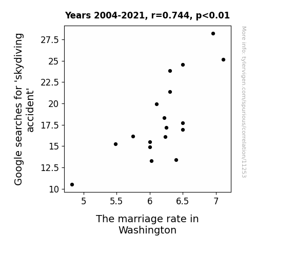 This means 55.4% of the change in the one variable (i.e., The marriage rate in Washington) is predictable based on the change in the other (i.e., Google searches for 'skydiving accident') over the 18 years from 2004 through 2021.