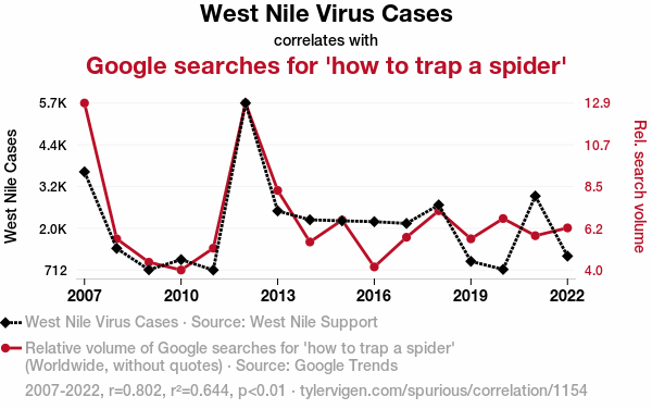 West Nile Virus, trap a spider, Google searches, correlation, West Nile Support organization, Google Trends, mosquito-borne illnesses, spider-catching tactics, pest-related dangers, internet queries, interconnectedness