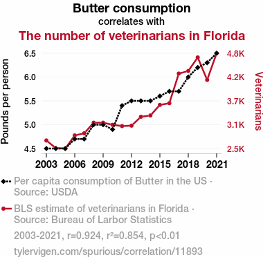 This means 85.4% of the change in the one variable (i.e., The number of veterinarians in Florida) is predictable based on the change in the other (i.e., Butter consumption) over the 19 years from 2003 through 2021.