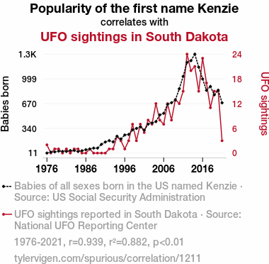 This means 88.2% of the change in the one variable (i.e., UFO sightings in South Dakota) is predictable based on the change in the other (i.e., Popularity of the first name Kenzie) over the 46 years from 1976 through 2021.