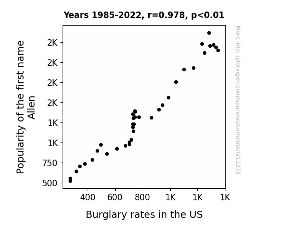 This means 95.7% of the change in the one variable (i.e., Burglary rates in the US) is predictable based on the change in the other (i.e., Popularity of the first name Allen) over the 38 years from 1985 through 2022.