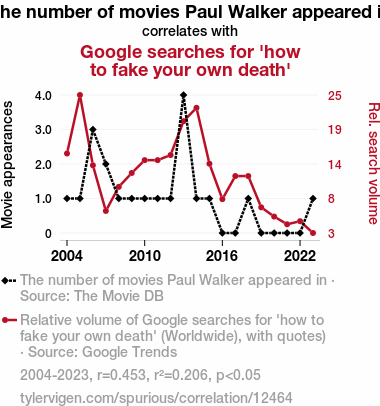 This means 20.6% of the change in the one variable (i.e., Google searches for 'how to fake your own death') is predictable based on the change in the other (i.e., The number of movies Paul Walker appeared in) over the 20 years from 2004 through 2023.